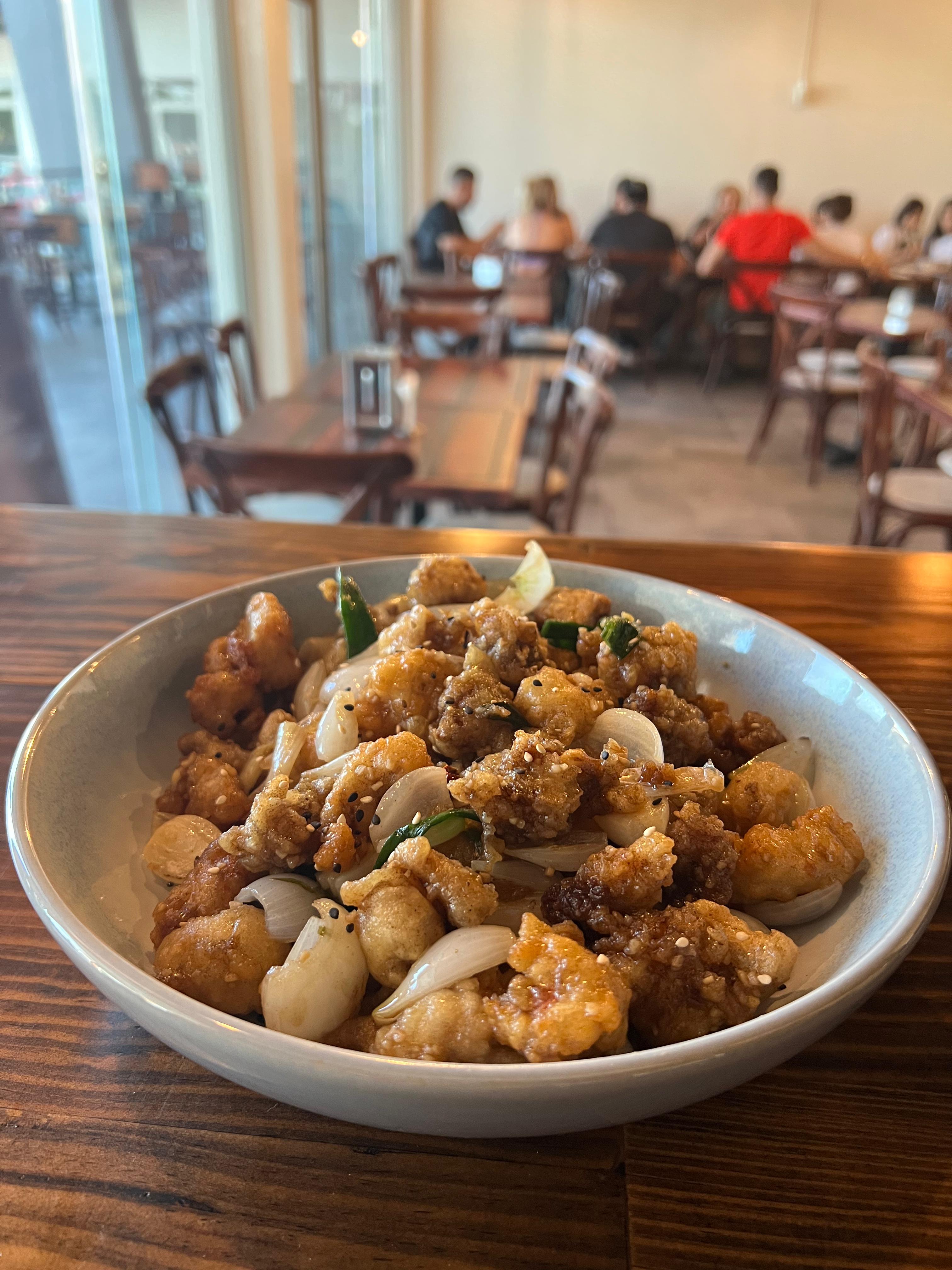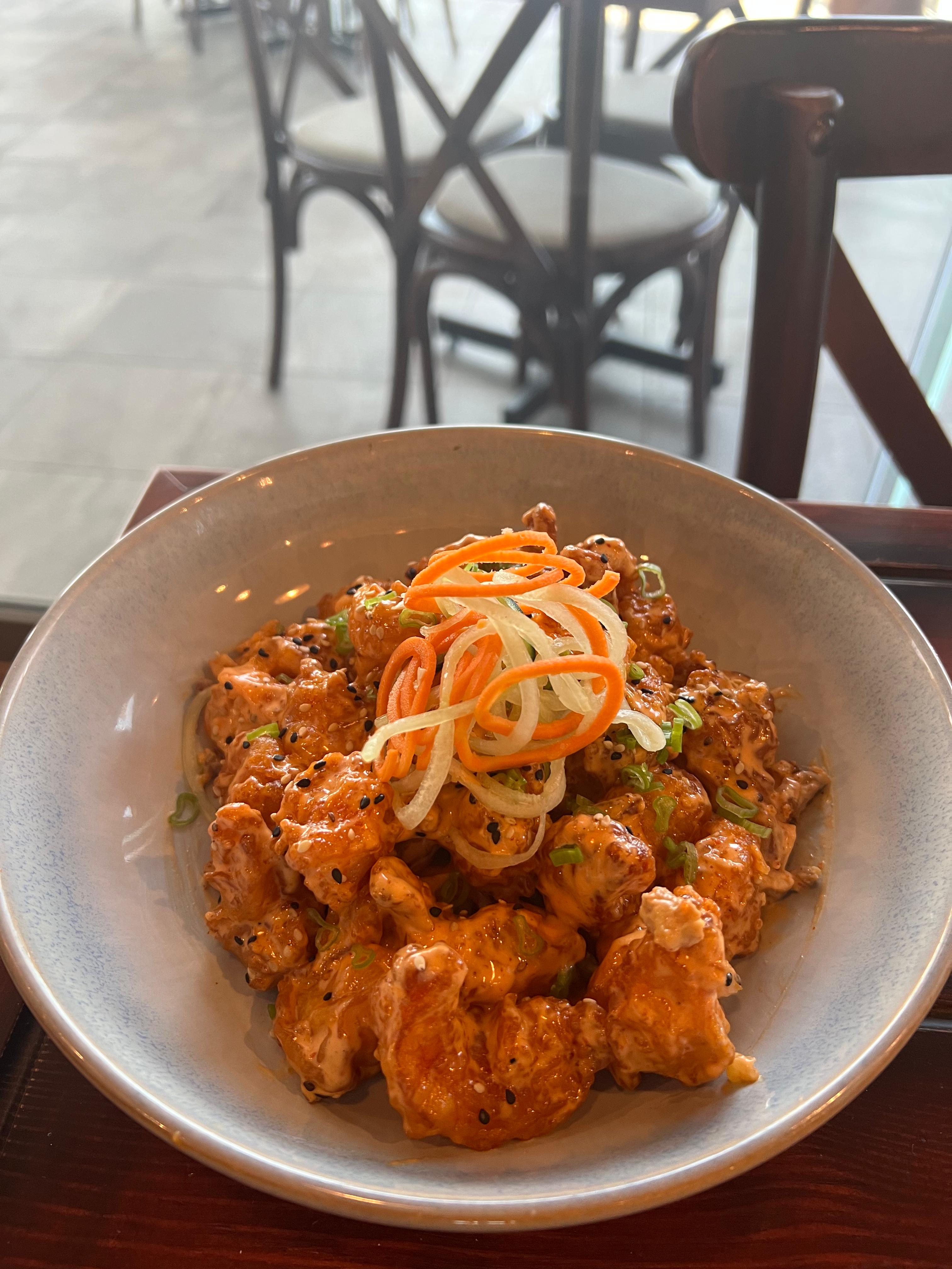 POLLO CAPEADO BAÑADO EN SALSA DE LA CASA PICOSITA ACOMPAÑADO CON CEBOLLÍN CAMBRAY SOBRE UNA CAMA DE ARROZ FRITO CON VEGETALES.