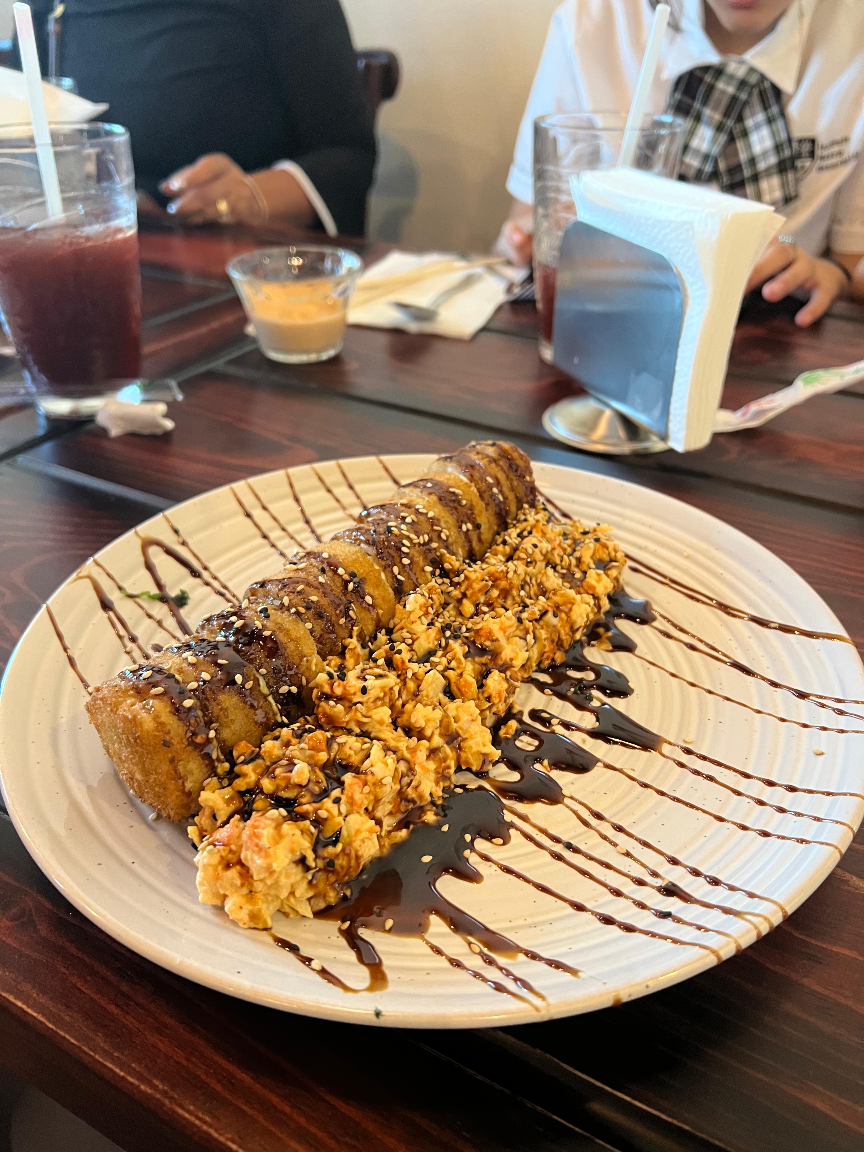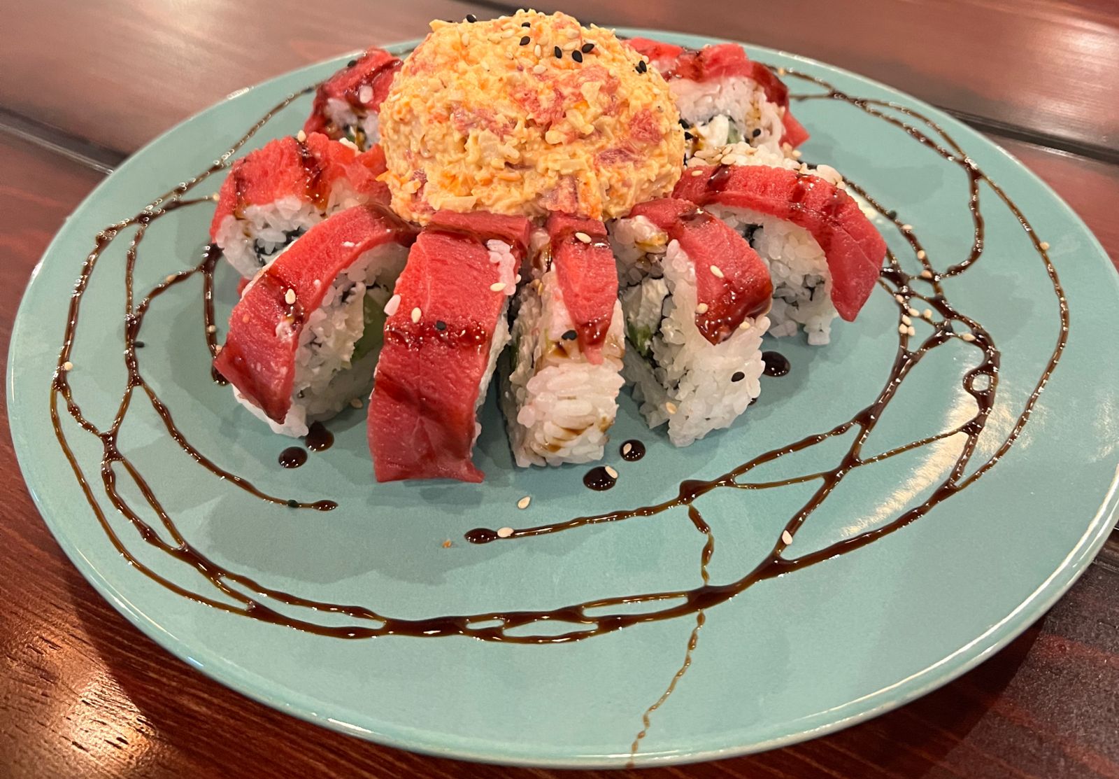 POR DENTRO AGUACATE, PHILADELPHIA Y PEPINO. FORRADO DE ATÚN. CORONADO CON UNA ENSALDA TAMPICO CON ATÚN, BAÑADO EN SALSA DE ANGUILA Y AJONJOLÍ.
