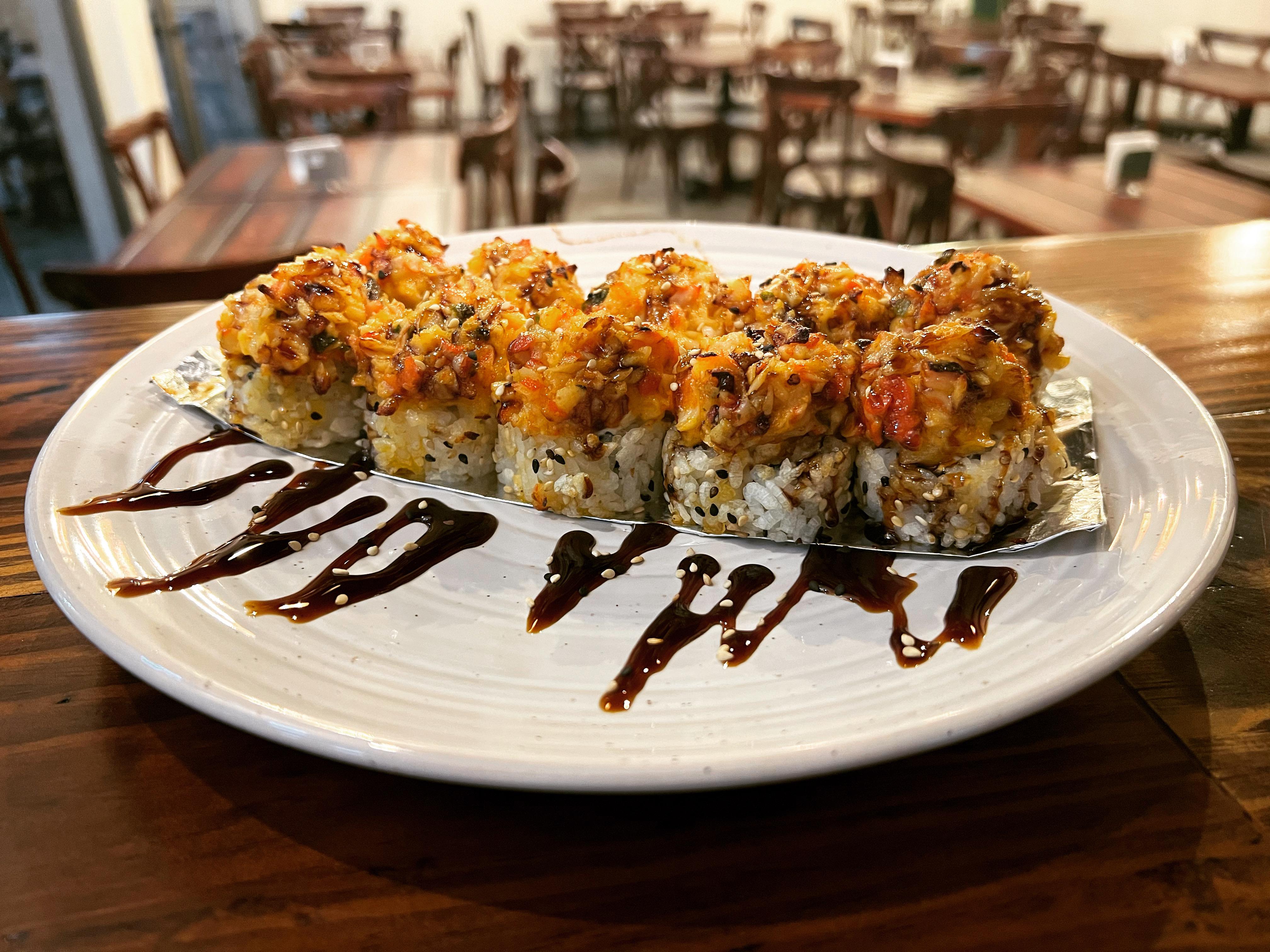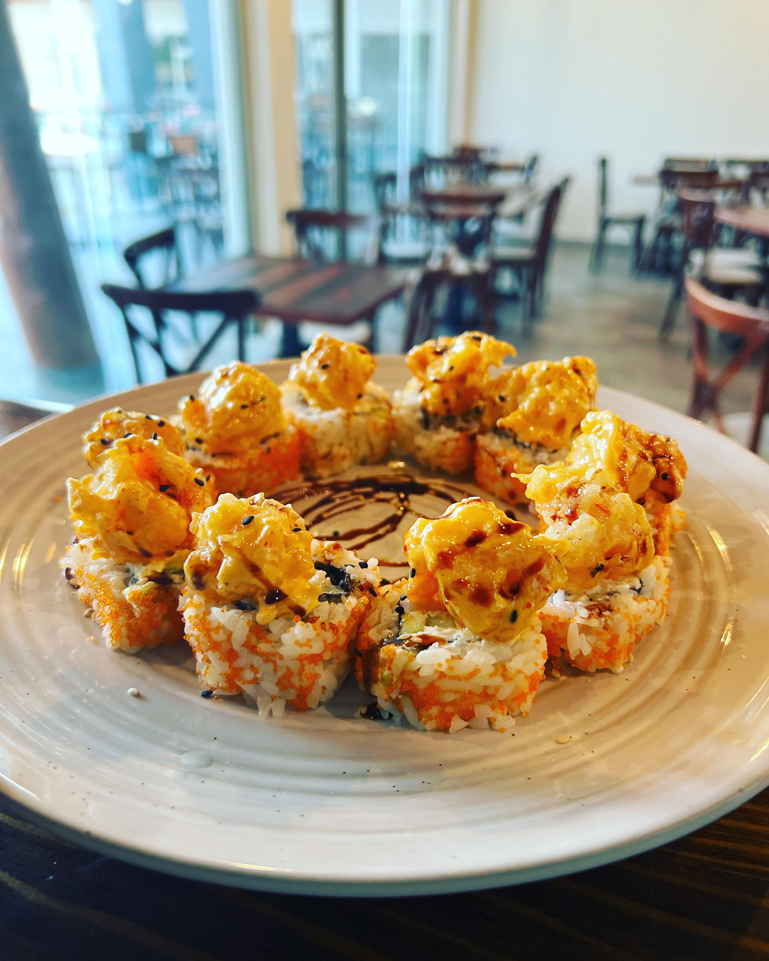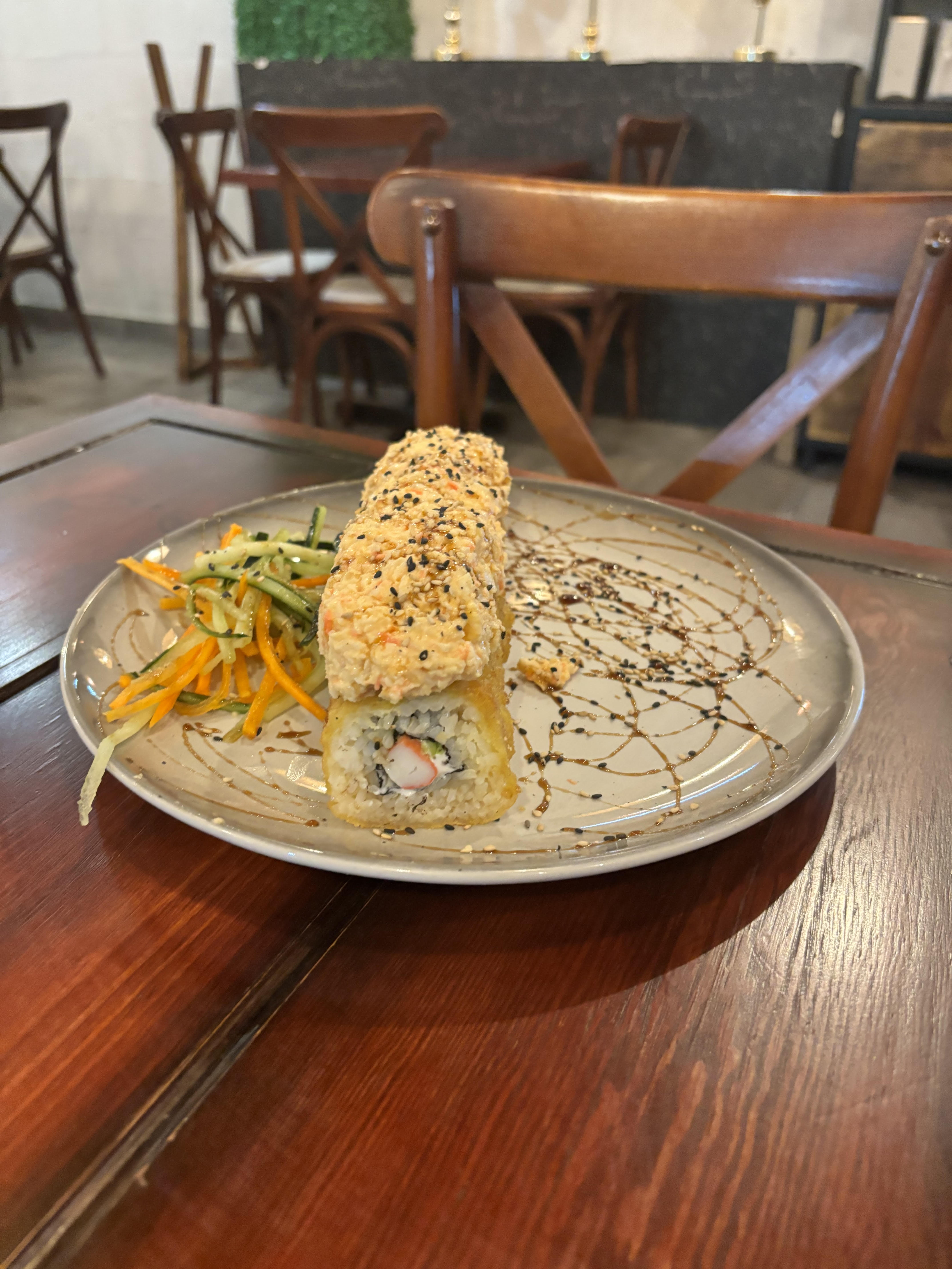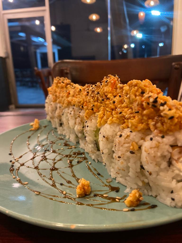 POR DENTRO AGUACATE, PHILADELPHIA, PEPINO Y CAMARONES EMPANIZADO. FORRADO EN AJONJOLÍ CORONADO CON UNA ENSALADA TAMPICO CON CAMARÓN Y PULPO. AL HORNO, BAÑADO EN SALSA DE ANGUILA Y AJONJOLÍ.