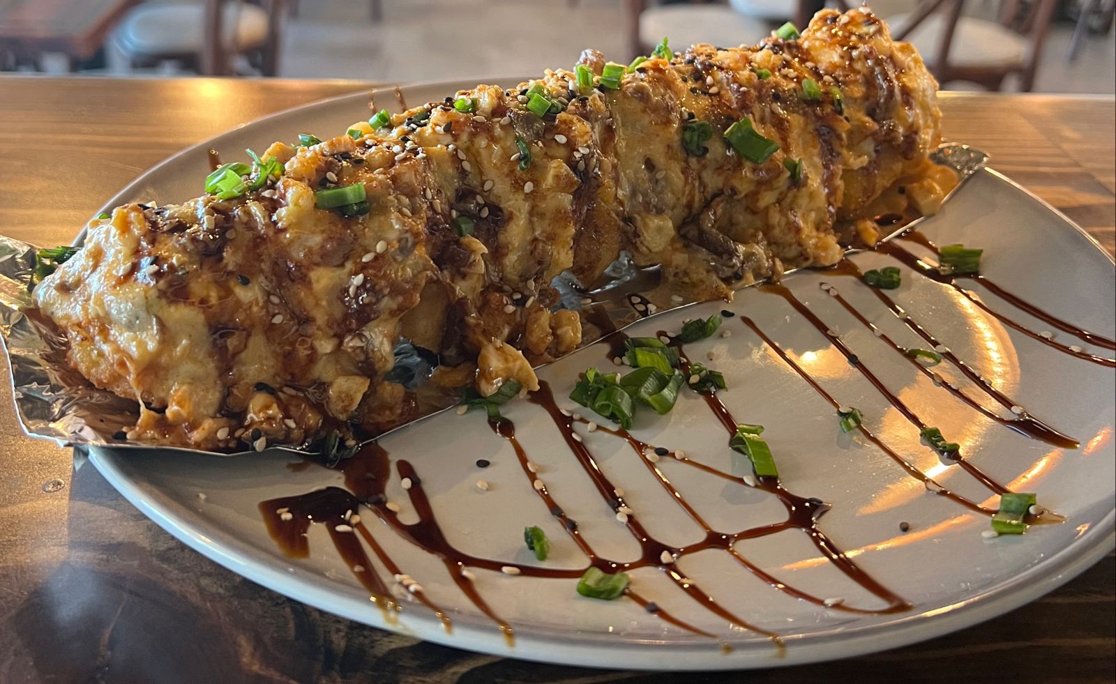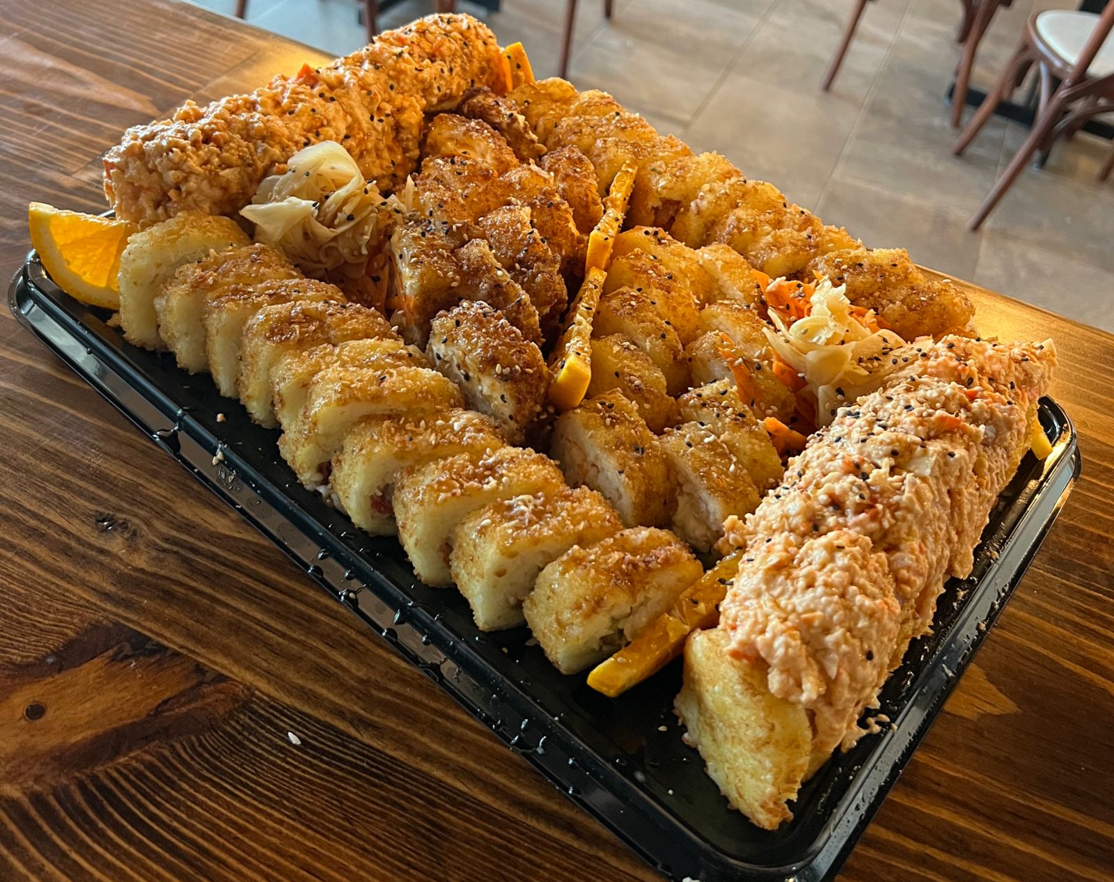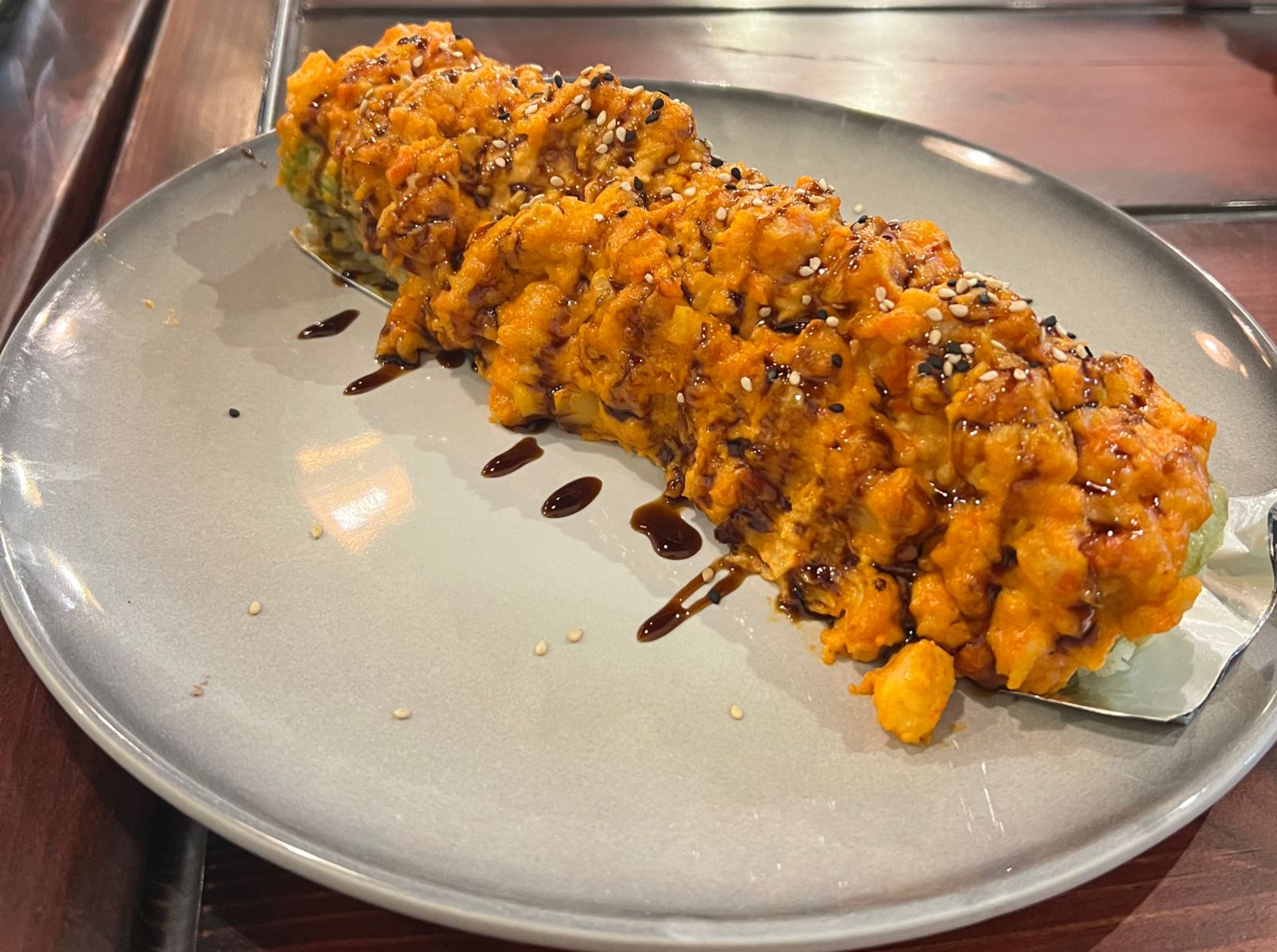 POR DENTRO AGUACATE, PHILADELPHIA, PEPINO Y CAMARONES EMPANIZADO. FORRADO EN AJONJOLÍ CORONADO CON UNA ENSALADA TAMPICO CON CAMARÓN Y PULPO. AL HORNO, BAÑADO EN SALSA DE ANGUILA Y AJONJOLÍ.