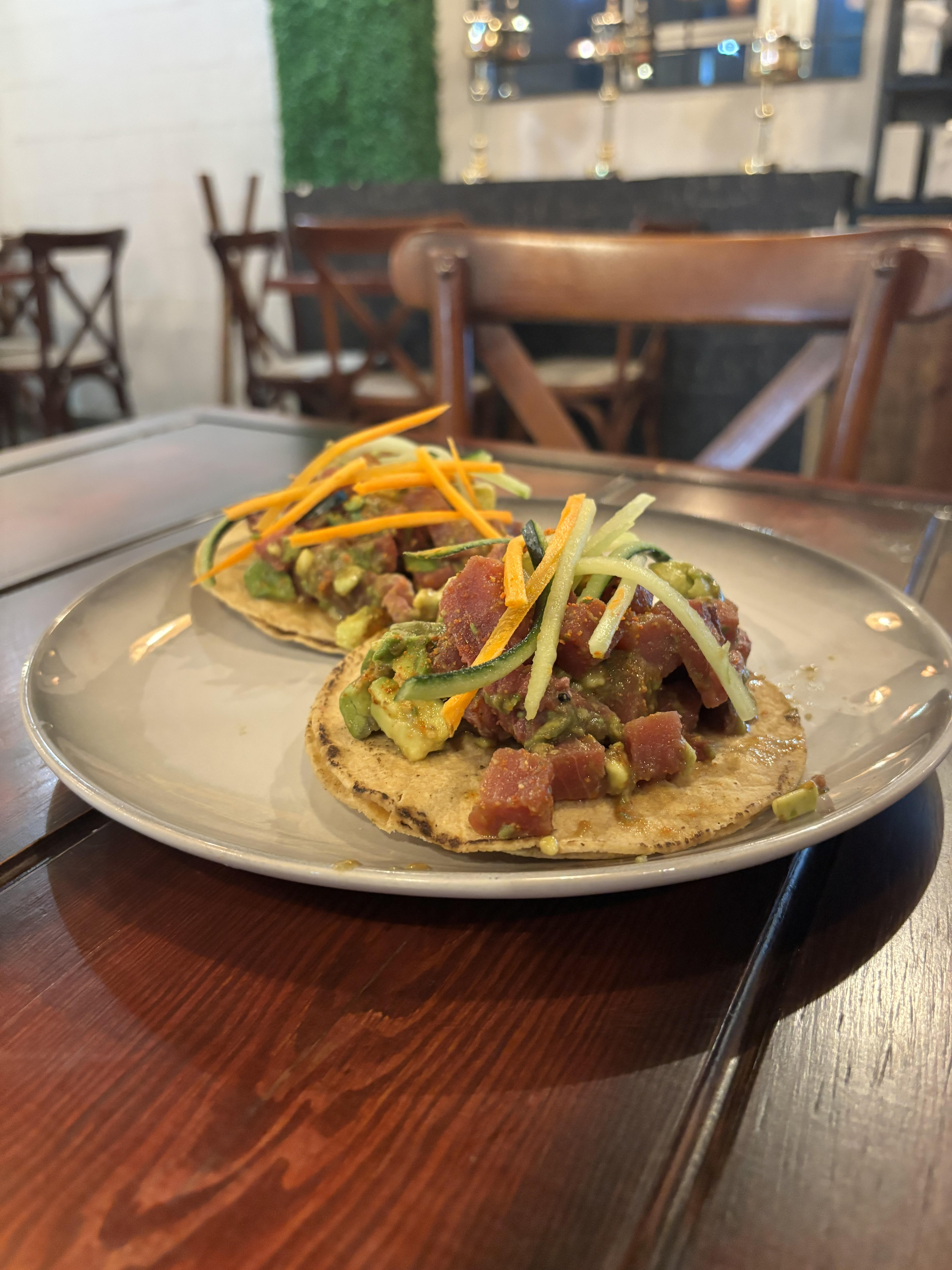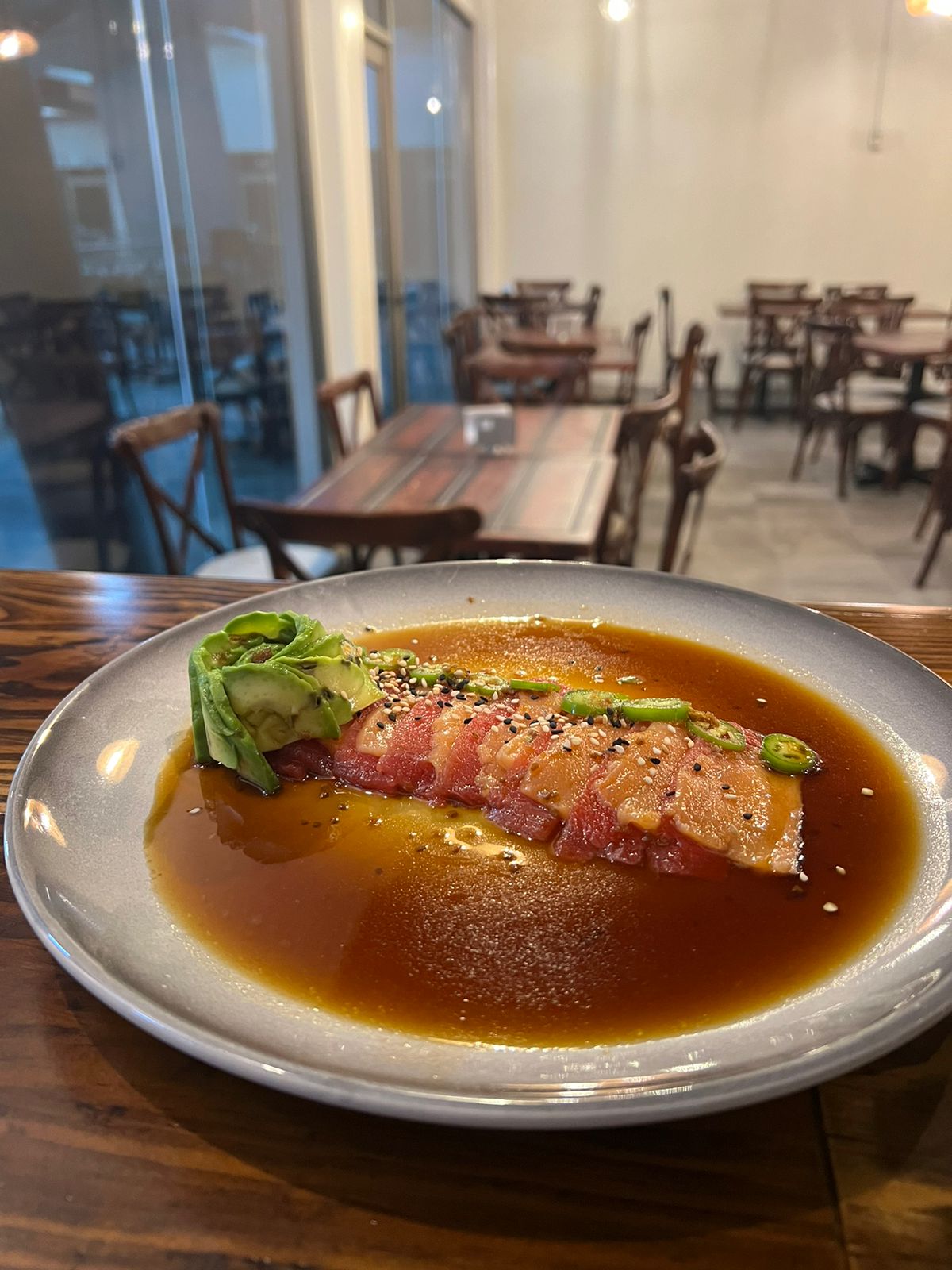 LÁMINAS DE ATÚN Y/O SALMÓN FRESCO BAÑADAS EN SALSA DE LA CASA CORONADO CON UNA FLOR DE AGUACATE Y CHILE SERRANO