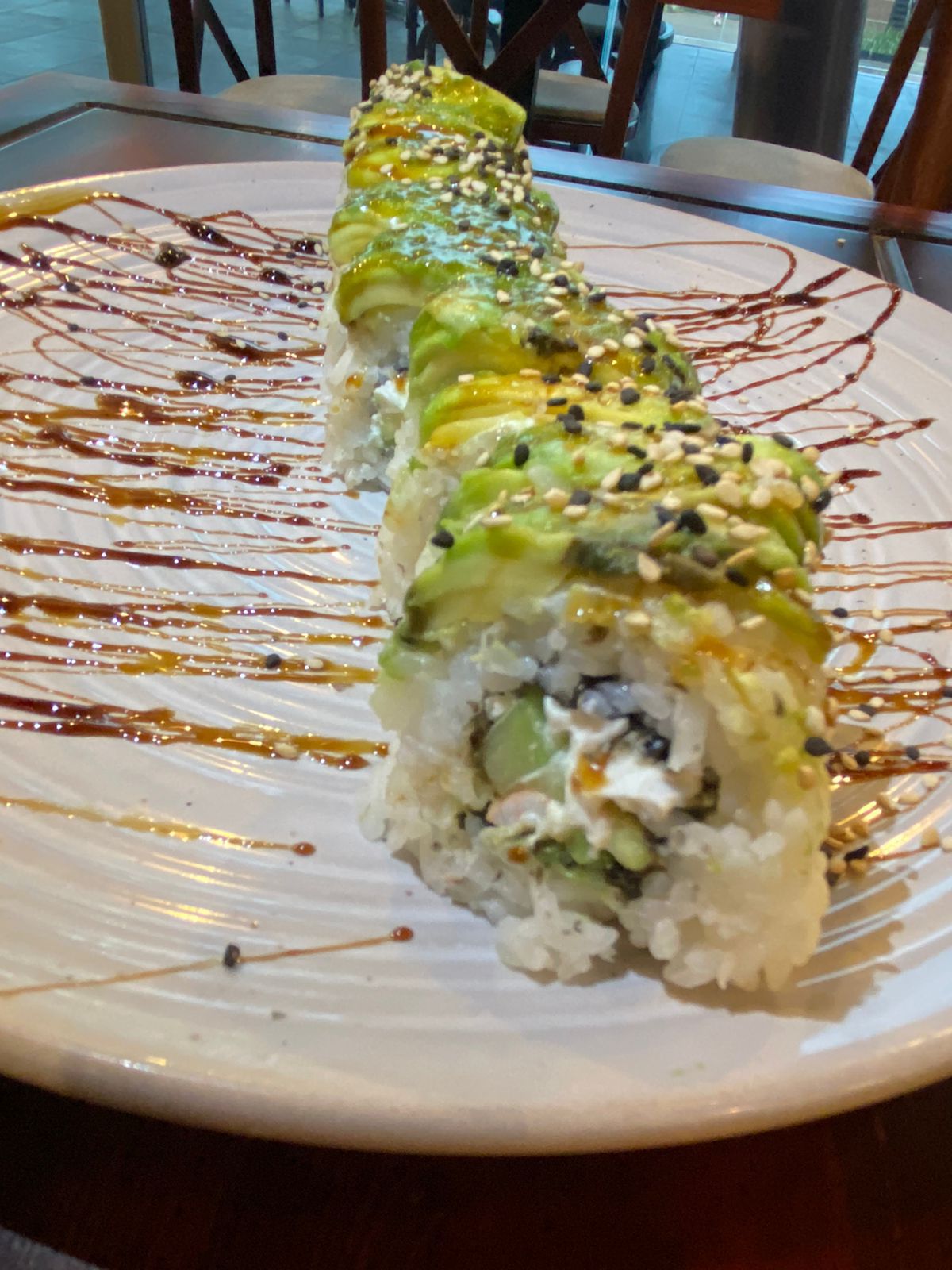 POR DENTRO AGUACATE, PEPINO, PHILADELPHIA Y CAMARÓN. FORRADO EN AJONJOLÍ. CORONADO CON UNA ENSALADA TAMPICO. BAÑADO EN SALSA DE ANGUILA Y AJONJOLÍ.