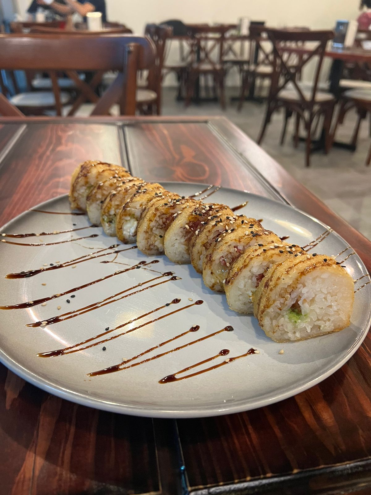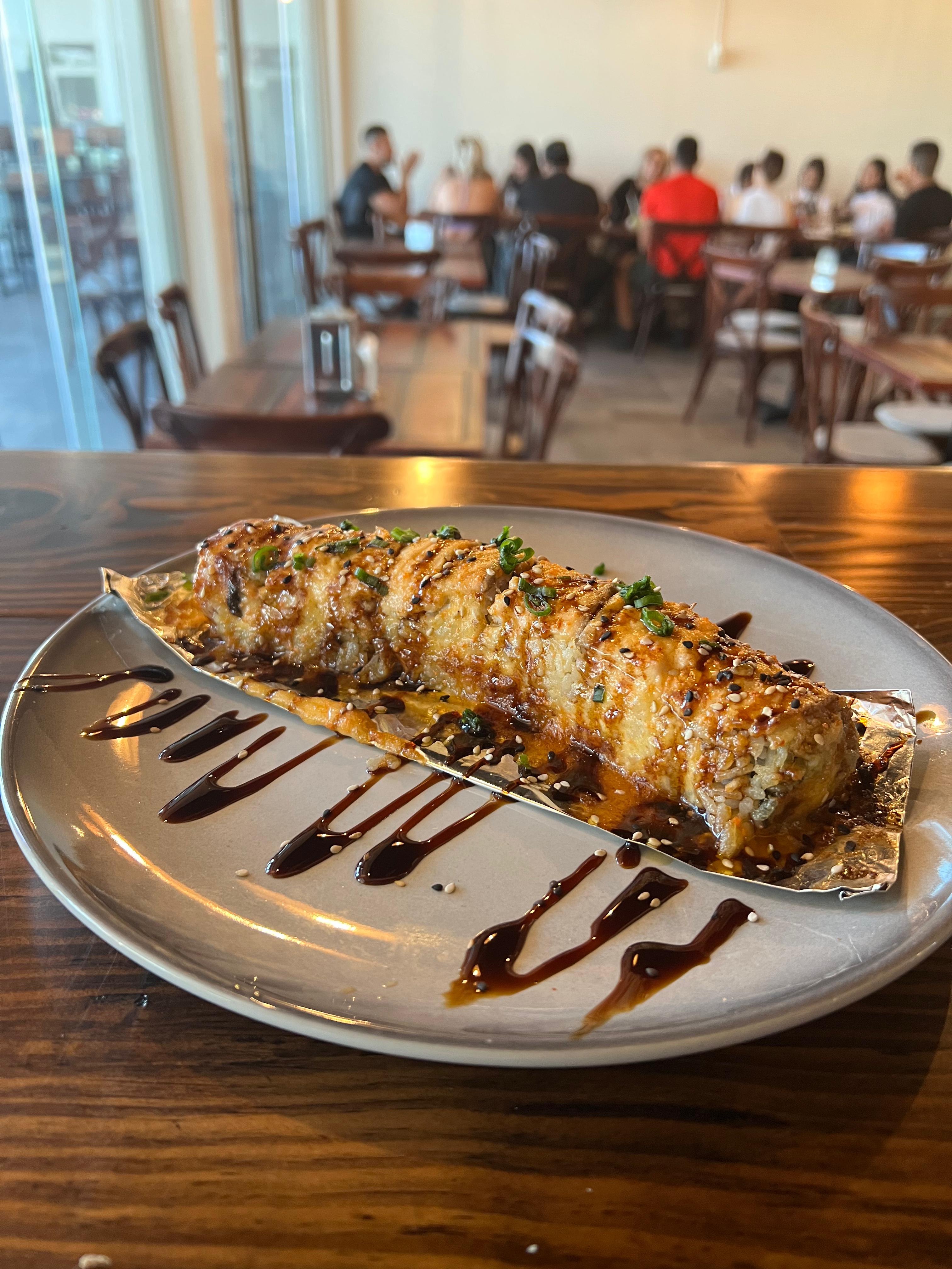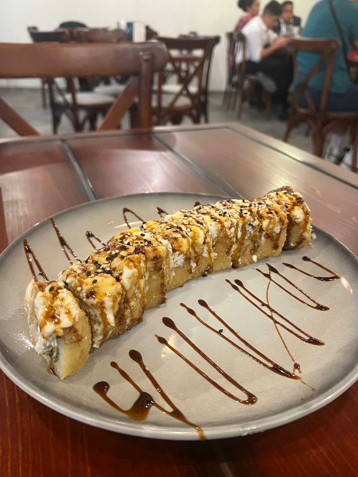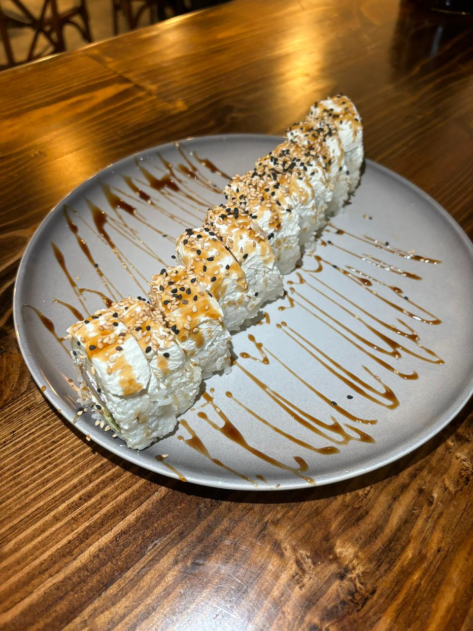 POR DENTRO AGUACATE, PHILADELPHIA Y CAMARÓN. POR FUERA PHILADELPHIA, QUESO AMERICANO Y GOUDA. BAÑADO EN SALSA DE ANGUILA Y AJONJOLÍ.
