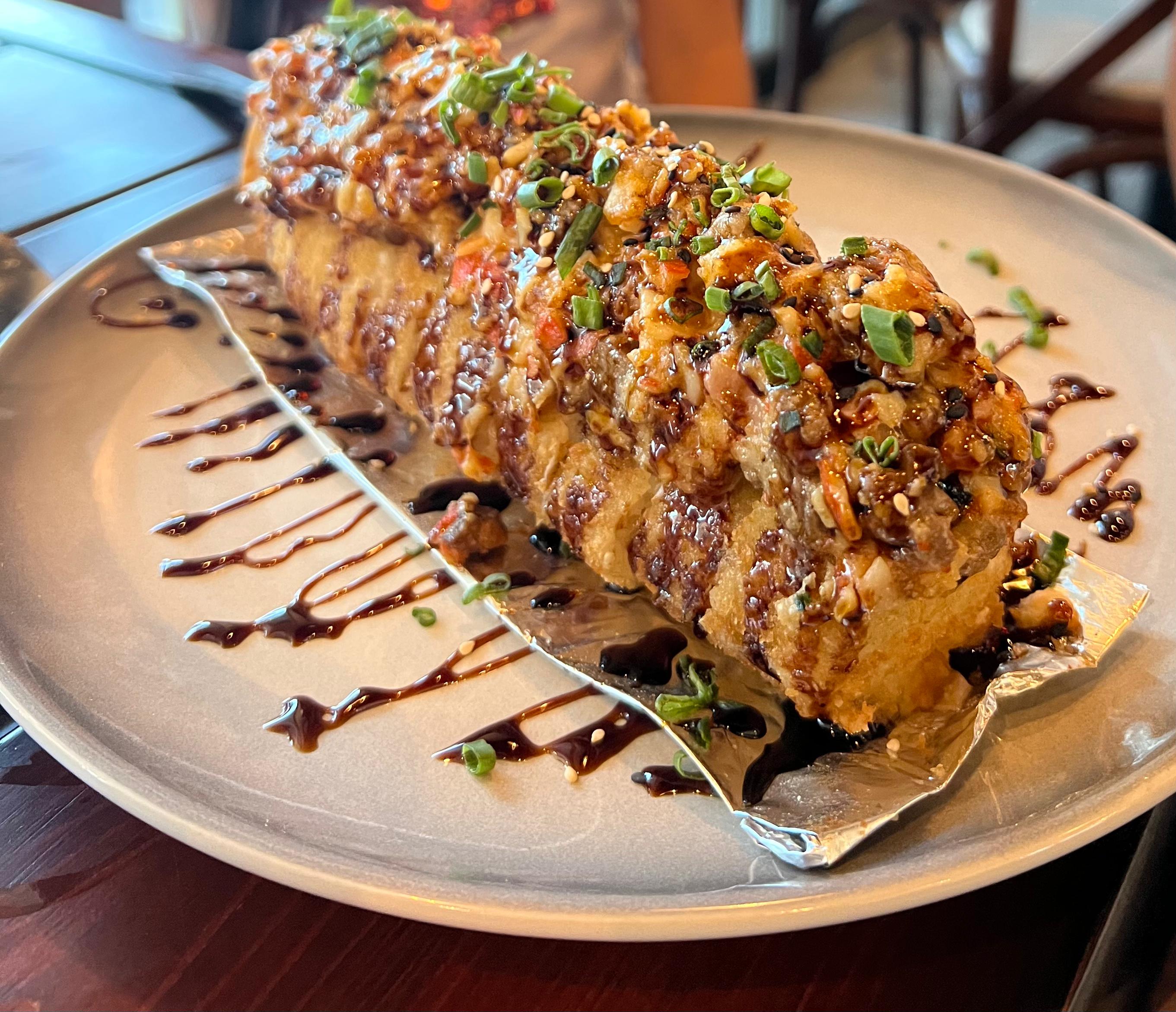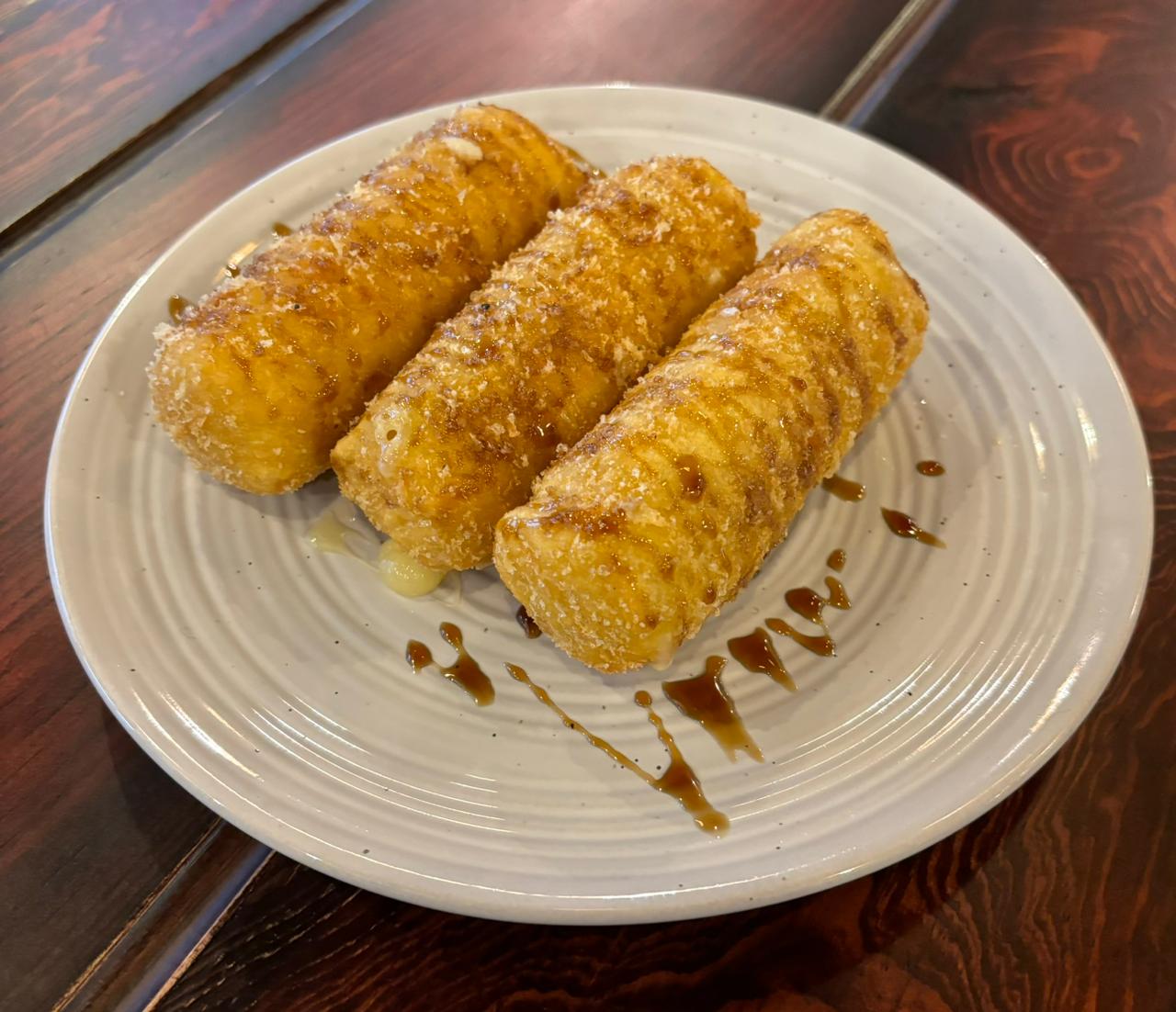 QUESO GOUDA CAPEADO Y EMPANIZADO, BAÑADOS EN SALSA DE ANGUILA Y ACOMPAÑADO DE ADEREZO CHIPOTLE.
