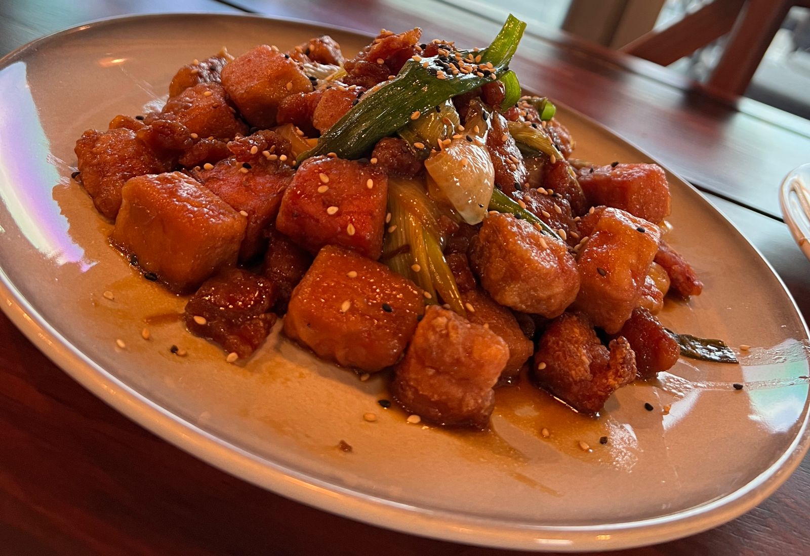 CHICHARRÓN DE ATÚN ACOMPAÑADO DE CEBOLLÍN CAMBRAY BAÑADO EN SALSA DE LA CASA SOBRE UNA CAMA DE AGUACATE CORONADO CON AJONJOLÍ.