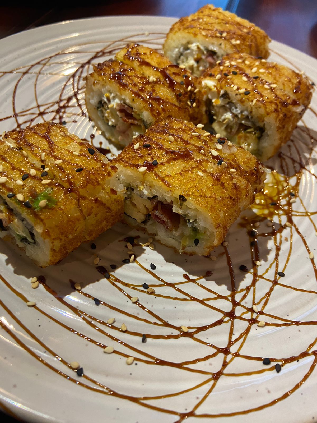 POR DENTRO AGUACATE, PHILADELPHIA, QUESO GOUDA, TOCINO Y CAMARÓN. BAÑADO EN SALSA DE ANGUILA Y AJONJOLÍ.