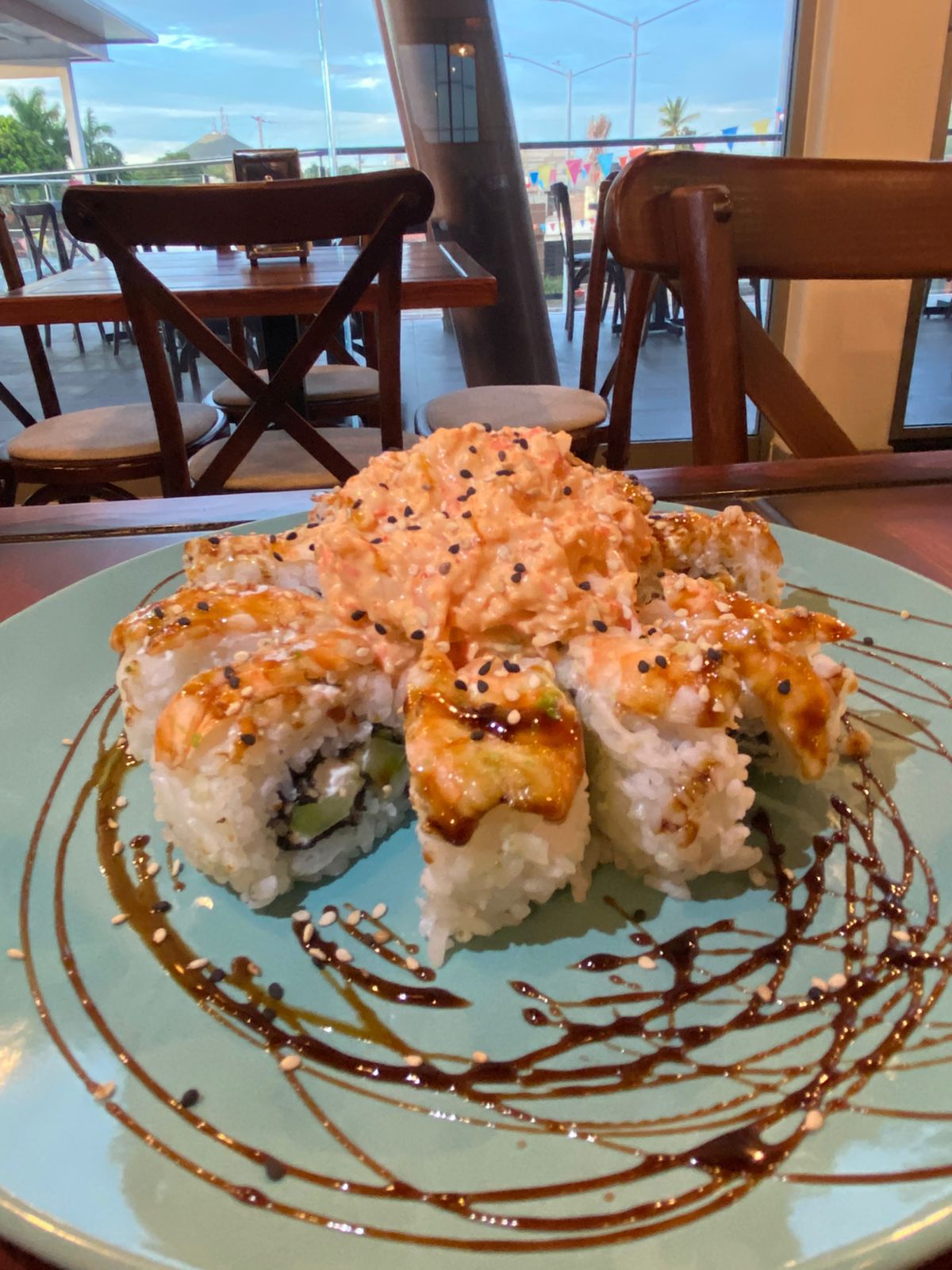 POR DENTRO AGUACATE, PHILADELPHIA, PEPINO Y CAMARÓN. FORRADO EN MASAGO CORONADO CON CAMARONES ROCKA. BAÑADO EN SALSA DE ANGUILA Y AJONJOLÍ.