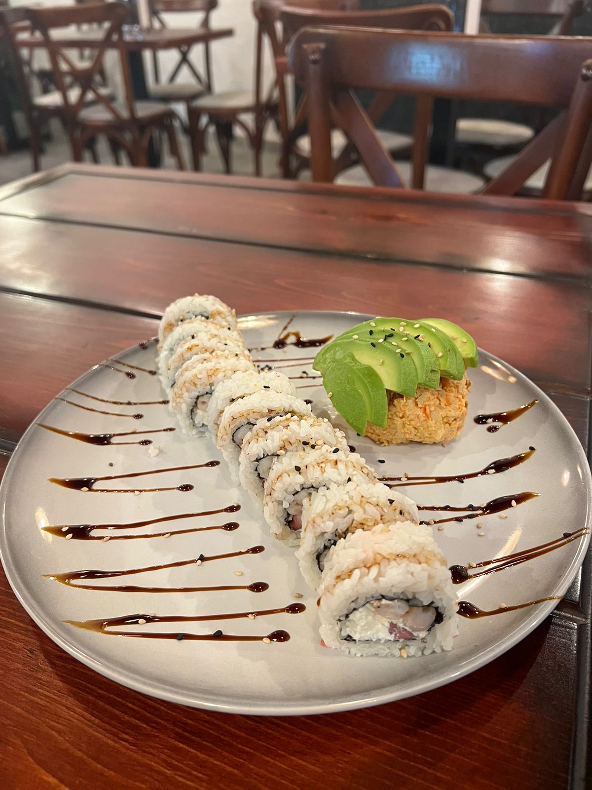 POR DENTRO AGUACATE, PHILADELPHIA, PEPINO Y CAMARÓN. FORRADO DE AGUACATE CON ENSALADA TAMPICO CON CAMARÓN PICOSO Y PAL HORNO. BAÑADO EN SALSA DE .ANGUILA Y AJONJOLÍ.