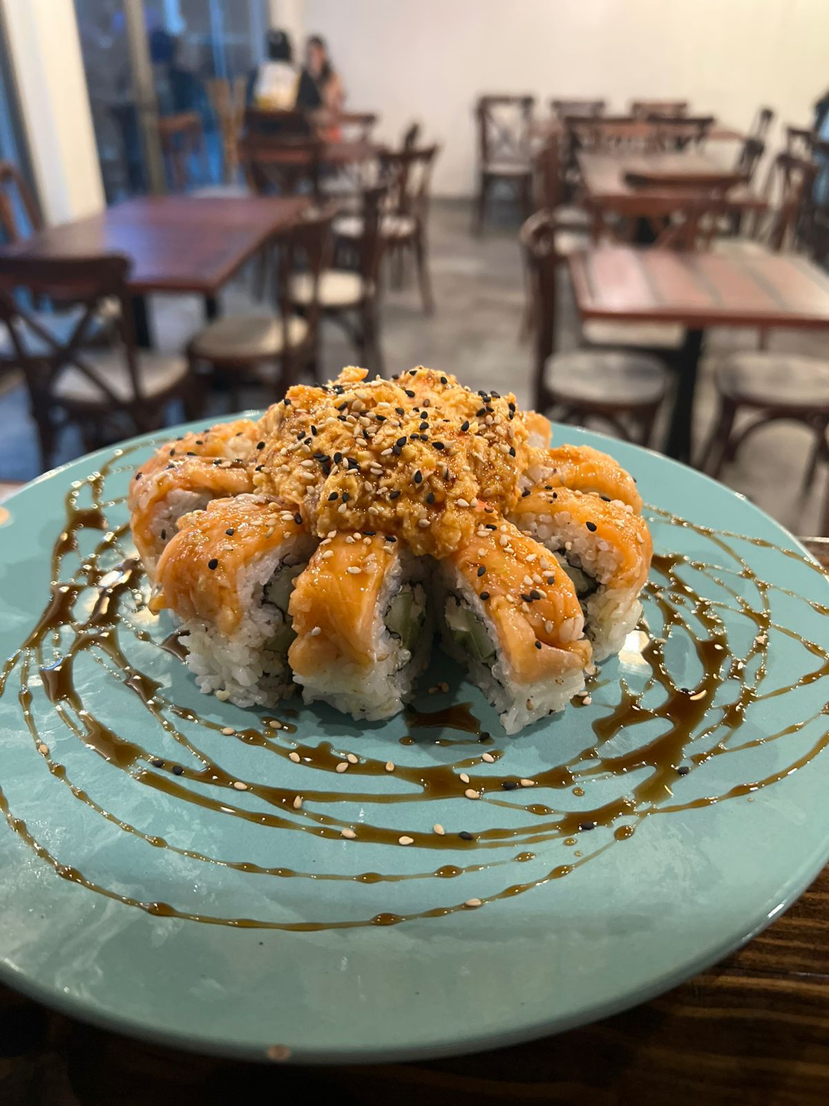 POR DENTRO AGUACATE, PHILADELPHIA Y PEPINO. FORRADO DE SALMÓN. CORONADO CON UNA ENSALDA TAMPICO CON SALMÓN, BAÑADO EN SALSA DE ANGUILA Y AJONJOLÍ.