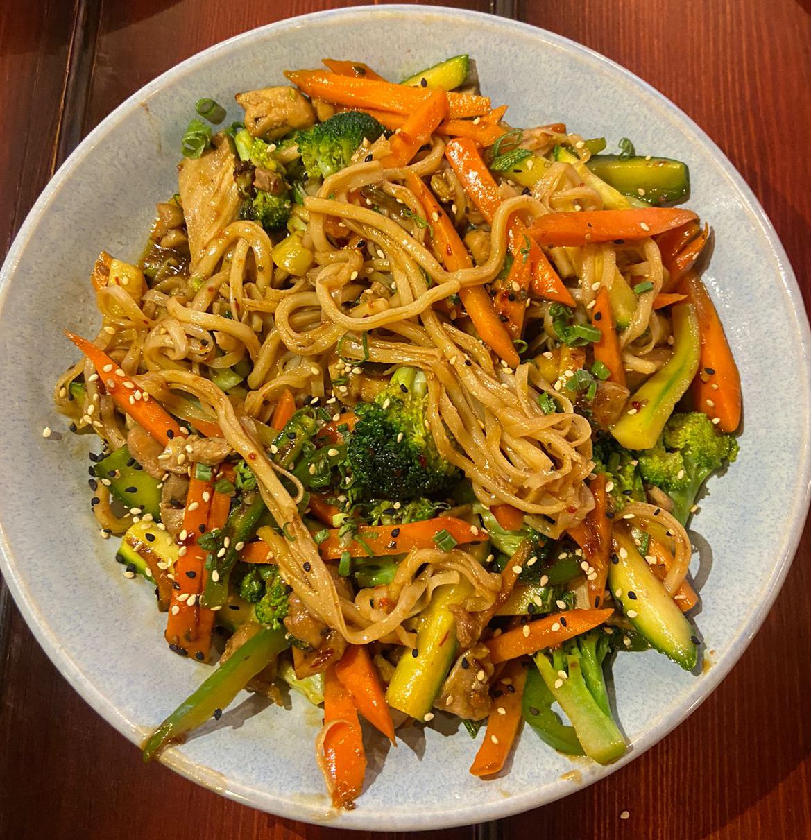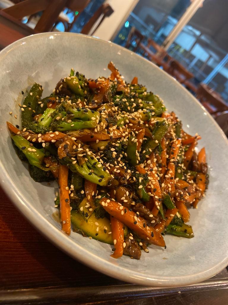 PROTEÍNA A ELECCIÓN SALTEADA ZANAHORIA, CALABAZA, BRÓCOLI, PIMIENTO Y PASTA, BAÑADA EN SALSA A ESCOGER CORONADO CON AJONJOLÍ