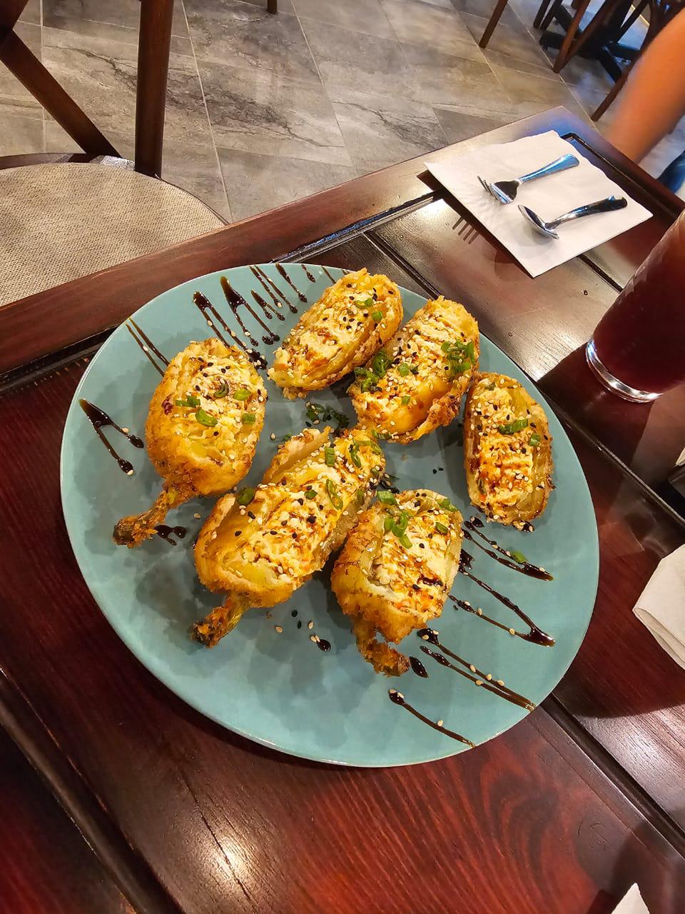 CHILES CARIBES RELLENOS DE ENSALADA TAMPICO Y TRES QUESOS, EMPANIZADOS Y BAÑADOS EN SALSA DE ANGUILA CON AJONJOLÍ.