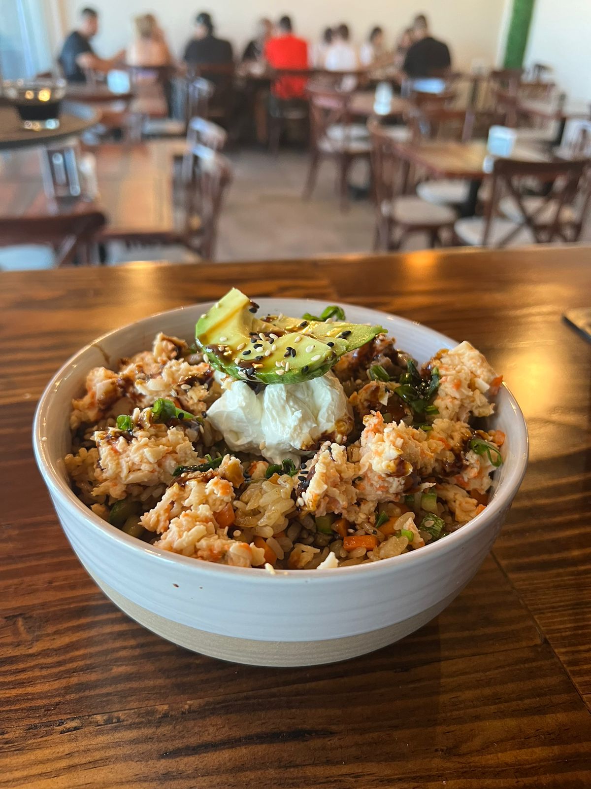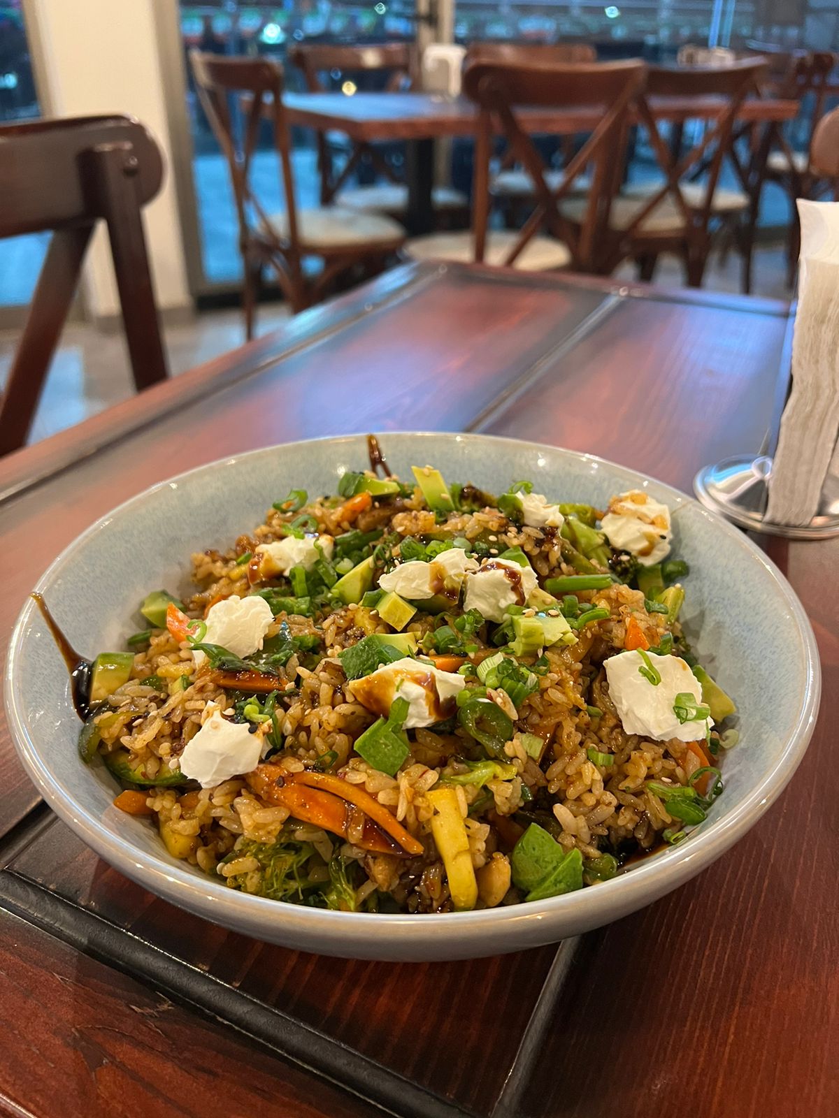 ARROZ FRITO CON SALSA PICOSITA DE LA CASA, PROTEÍNA A ELEGIR SALTEADA CON ZANAHORIA, CALABAZA, BRÓCOLI, PIMIENTO. CORONADO CON QUESO CREMA, AGUACATE BAÑADO EN SALSA DE ANGUILA Y AJONJOLÍ.